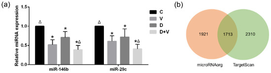Differential miRNA validation and target prediction. (a) MicroRNA expression levels measured by RT-PCR. Data were corrected by the expression level of 18s RNA. The relative expression level was calculated by setting the control group expression level as 1. * p < 0.05 compared with group C; Δ p < 0.05 compared with group V. (b) Venn chart of the predicted target genes discovered by the TargetScan and microRNA.org databases.