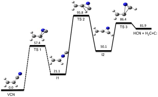 Our automated computational study on the dissociation of vinyl cyanide (VCN) [70] provides a HCN/HNC branching ratio in nearly perfect agreement with experiments for an excitation energy of 148 kcal/mol [95]. Besides the traditional 3-center and 4-center elimination mechanisms found in many HX eliminations from CH2=CHX systems, a new HCN elimination pathway involving three TSs was discovered in the tsscds study. The new mechanism involves three TSs and two intermediates and is shown in Figure 1.