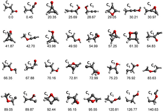 Minima obtained by tsscds for the C3H4O system. The structures are arranged in ascending order of their relative energies (shown at the bottom of each structure), which are obtained at the CCSD(T)/6-311+G(3df,2p)//B3LYP/6-311G(d,p) level of theory. Conformers are not included in the figure and only the lowest lying of each family is displayed.