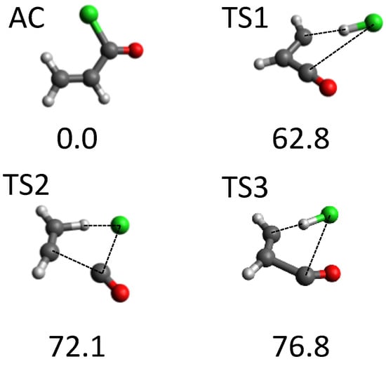 Another system that attracted our attention was acryloyl chloride (AC). Overall, around 700 stationary points were found using our tsscds strategy. Of all possible dissociation channels from AC, experiments focus on the HCl dissociations. The use of our automated procedure led to the discovery of the three new HCl dissociation TSs [69] displayed in Figure 4; the figure also shows the AC equilibrium structure. The highest-energy TSs (TS2 and TS3) correspond to three-body dissociations leading to acetylene, carbon monoxide and hydrogen chloride, and they only become important at high excitation energies. By contrast, HCl elimination over TS1 is predominant at the experimental conditions (148 kcal/mol) [98], showing again that tsscds is capable of finding competitive pathways.