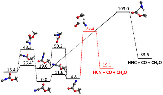 Relevant HCN and HNC pathways in the ground-state PES of methyl cyanoformate for an excitation energy of 148 kcal/mol. Relative energies (in kcal·mol−1) include ZPE contributions and were obtained by CCSD(T)/6-311++G(3df,3pd)//MP2/6-311+G(2d,2p) calculations.