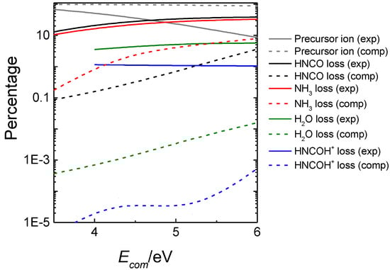 The resulting computationally-predicted product abundances (dashed lines) are compared in Figure 6 with the experimental ones (solid lines). As seen in the figure, for the predominant dissociation channels, the computationally-predicted product abundances are in qualitative agreement with experiment, and formation of HNCO (black), NH3 (red), H2O (green) and HNCOH+ (blue) are the major channels. Discrepancies with experiment can be attributed to the possible existence of well-known non-statistical behavior in many collision-induced dissociations [100,114], which cannot be captured with our statistical model.