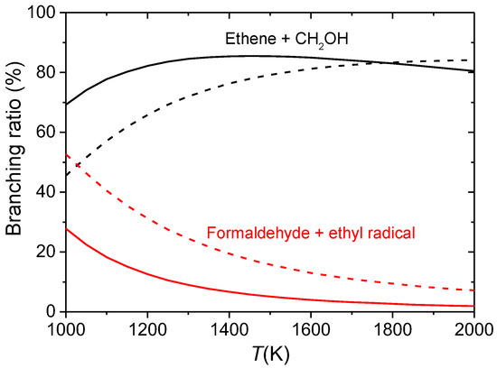 Branching ratios obtained in the kinetics simulations starting from one of the isomers of 1-propanol (only the two major mechanisms are shown). The solid and dashed lines correspond to the MP and 1W results, respectively.