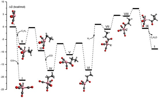 Free energy profile for the Co-catalyzed hydroformylation of ethylene obtained in our tsscds study using DFT calculations [133].