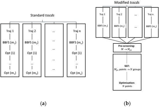 In standard tsscds, every single structure obtained after the BBFS analysis is subjected to TS optimization [45]. As seen in Figure 9a, for a trajectory , BBFS selects TS candidates, which results in optimizations, where is the total number of trajectories. On the one hand, these optimizations are the most CPU-time consuming step of the procedure as they involve Hessian calculations, while the integration of the trajectories only requires gradients. On the other hand, a number of those optimizations are repeated. This is so because trajectories visit more often those areas of the configurational space around the kinetically most relevant TSs, leading to multiple optimizations of those structures.