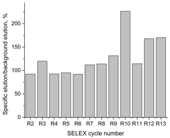 The amount of the eluted target ssDNA was quantified using Cy3 fluorescence. The amount of ssDNA eluted both by the buffer (background elution) and by the target (specific elution) was monitored during the selection (Table 1). Their ratio can be used for the monitoring of the aptamer selection progress [23]. At the starting rounds, when there were few oligonucleotides with specific affinity to the target in the eluted ssDNA pools, nearly the same amounts of DNA were eluted, both by the buffer and by the target solution. During the selection process, the DNA pool is enriched with aptamers, and in the presence of the target, more DNA is eluted from the capture probe, in comparison to background. When the ratio of the amount of specifically-eluted DNA to background elution stops increasing, the enrichment process is believed to have been finished [23]. The enrichment of the eluted DNA pool is presented on Figure 1. The maximum ratio of the specific elution by furaneol to background elution was observed during the tenth round. During the following cycles of selection, the amount of eluted DNA decreased, due to the lower yield of ssDNA regeneration (see Table 1), and the ratio of the specific to background elution also started decreasing. The selection was stopped at the thirteenth cycle.