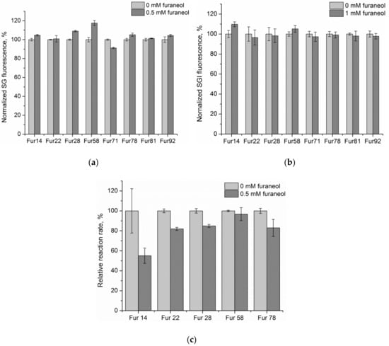With p = 0.05, the difference between the bars was statistically significant for Fur28, Fur71, Fur58, and Fur14 in Figure 3a, for Fur14 in Figure 3b, and Fur22 and Fur28 in Figure 3c. Fur_14 oligonucleotide showed doubtful results in the exonuclease I protection assay (Figure 3c). It demonstrated the maximum difference between the reaction rate, in the presence and absence of the target, but according to the t-test, this difference did not prove to be statistically significant, due to large error bars of the experimental points. Fur14 was additionally tested in exonuclease I protection assay with 200 µM furaneol, and the reaction rate in the presence of the target decreased, significantly, in comparison to the probes without furaneol (see Figure S4). Fur14 showed the best binding results in the SYBR Green I assay and the exonuclease reaction assay. In the specific elution assay, Fur_58 had the maximum elution at the highest furaneol concentration (500 µM, Figure 3a). Fur_14 exhibited moderate binding in the specific elution assay (Figure 3a). Based on a combination of the results of three assays, Fur_14 was selected as the aptamer for further characterization.