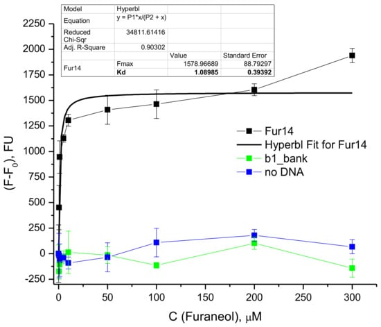 The apparent equilibrium constant for the Fur_14 oligonucleotide was determined using the SYBR Green I assay [33]. The aptamer was incubated with furaneol, at different concentrations, and the DNA was stained with the SYBR Green I fluorescent intercalating dye. Emissions of the SYBR Green I increased with the furaneol concentration. The equilibrium dissociation constant (KD) of the aptamer-furaneol interaction was calculated using non-linear regression (Figure 4). KD was estimated to be (1.1 ± 0.4) µM.