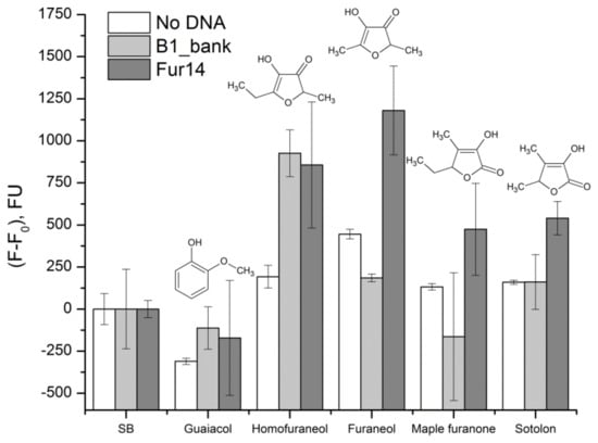 Selectivity of Fur_14 was checked by the SYBR Green I assay to compounds structurally similar to furaneol—maple furanone (5-Ethyl-3-hydroxy-4-methyl-2(5H)-furanone), sotolon (4,5-Dimethyl-3-hydroxy-2,5-dihydrofuran-2-one), homofuraneol (5-Ethyl-4-hydroxy-2-methyl-3(2H)-furanone), and guaiacol (2-Methoxyphenol). The B1_bank was used in the same assay as the non-binding DNA control. Results of the experiment are presented in Figure 5. All the targets caused change in the background fluorescence of the SYBR Green I dye. Experimental points for both Fur14 and B1_bank were corrected to this background fluorescence. Fur14 showed good selectivity to furaneol, in comparison to other compounds, some specific signal was also caused by the maple furanone and the sotolon.