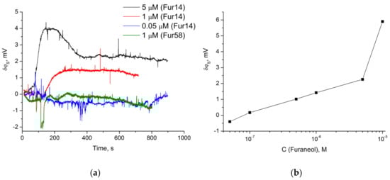 (a) Real-time signal of the ISFET modified with Fur14 and Fur58 oligonucleotides, to the addition of furaneol at different concentrations. (b) Dependence of the biosensor signal at ~450 s, after furaneol addition onto the target concentration. ISFET was modified with a Fur14 oligonucleotide.