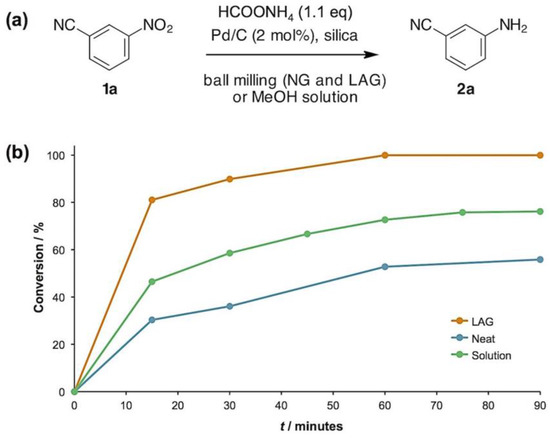 The advantage of performing the solid state ammonium formate promoted hydrogenation reaction is revealed in Figure 1b. The rate of 3-nitrobenzonitrile (1a) reduction as a model reaction (Figure 1a) in methanol (solution reaction) at room temperature using the same molar quantities of reactants as in milling reaction (1.1 eq of formate, 2 mol% of Pd/C (10 wt%)) shows partial conversion to product 2a (ca. 70% after 90 min) monitored by HPLC. In the case of mechanochemical synthesis, the LAG reaction reaches quantitative conversion in 60 min [57]. We note that 3-nitrobenzonitrile reduction under neat grinding conditions is much less efficient in comparison with LAG reaction, reaching only ca. 55% conversion after 90 min. As previously demonstrated for mechanochemical amination of thiocarbamoyl benzotriazoles, the physico-chemical interaction of in situ formed gases and liquids used in LAG can have a profound effect on the outcome of milling reactions [58].