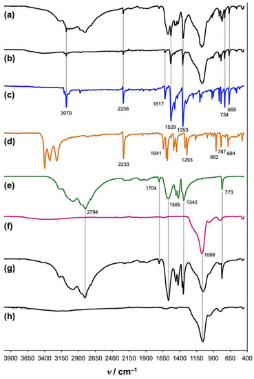 FTIR-ATR monitoring of aging reactions in open air. Reaction mixture after (a) gentle manual grinding for 2–3 min; (b) aging for 3 days; (c) 3-nitrobenzonitrile (1a); (d) 3-cyanoaniline (2a); (e) ammonium formate; (f) silica; (g) LAG for 60 min without substrate 1a; (h) LAG-mixture under (g) after aging for 2 h in air.