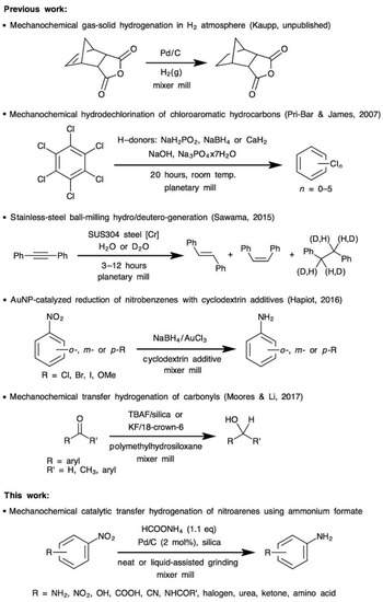 Therefore, one can envisage that hydrogenation reaction might also be transferred into the arena of mechanochemically-assisted organic synthesis [23,24,25,26,27]. Significant progress has been made over the last several years in this respect, with mechanochemistry securing its place in organic chemistry areas like organocatalysis [28,29,30] and metal-catalysis [31], C–H functionalization [32,33], multicomponent reactions [34] and so forth. Considering the expansion of literature on utilising solid-state milling as a synthetic tool, the mechanochemical hydrogenation still remains one of the underexplored areas with only a few papers published (Scheme 1).