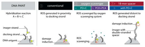 To summarize, we have confirmed that docking strands in DNA-PAINT microscopy are depleted by irradiation with visible light in an indirect process mediated by the excitation of fluorescent dyes. DNA-PAINT microscopy with long acquisition series showed that individual docking sites get irreversibly lost in irradiated areas (Figure 2 and Figure 3). In the majority of SMLM methods, the resolution and signal-to-noise ratio (SNR) of super-resolved images are limited by the photon-budget of fluorophores irreversibly bound to labeled sites [8,9]. Making use of the reoccurring binding and a large reservoir of fluorescent imager, DNA-PAINT is less limited by the photo-bleaching of fluorophores to precisely localize binding sites [11]. In this work, we showed that DNA-PAINT is ultimately limited by the eventual damage of docking sites.