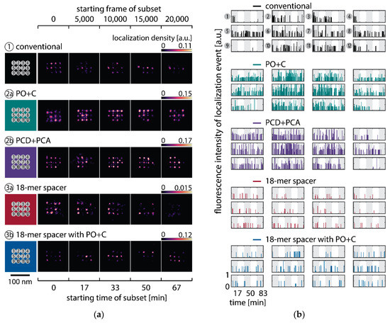 Selected DNA-PAINT super-resolved images of DNA nanostructures showing the depletion of binding sites in the five different conditions. (a) Images for the conventional imager (1). Five rows display different nanostructures that showed a high number of initially available docking sites. Images along the five columns represent the localizations within a subset of 5000 frames from a 25,000 frame long measurement. Scale bar: 100 nm. (b) Images taken with addition of the oxygen scavenging buffer PO+C (2a), PCD+PCA (2b), extension with an 18-mer spacer (3a) and the combination of 18-mer spacer and PO+C (3b).