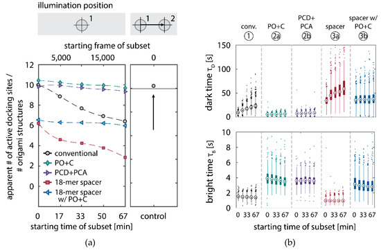Further, the depletion can also be analyzed based on the kinetics of the reoccurring binding events to individual DNA origami. We use the well-established analysis of the duration of individual binding events and the time span between two consecutive binding events, referred to as bright time and dark time , respectively [11,12,13]. For the conventional imager strand (1), we observe an increasing dark time for later subsets, which directly reflects on the depletion of binding sites (Figure 3b, top). For completely depleted binding sites, the dark time becomes theoretically infinite. In practice, noise misinterpreted as localization event limits the dark times and leads to a large scatter of the distribution of dark times for later subsets. With the addition of oxygen scavenging buffers (2a,b), the average dark time appears shorter and does not show any significant dependence on the measurement time, indicating a strong reduction in the depletion of binding sites. The two oxygen scavenging systems PO+C and PCD+PCA seem to perform similarly well in reduction of the depletion. For the 18-mer spacer, dark times are higher as for the conventional imager, reproducing the apparent lower association rate (Figure 2b and Figure 3b). Without oxygen scavengers (3a), an increase in dark times is observed, as depletion of binding sites is induced under the chosen irradiation conditions. Adding oxygen-scavenger to the 18-mer spacer (3b) stabilizes the dark times on the level observed in the first subset without oxygen scavengers (3a).