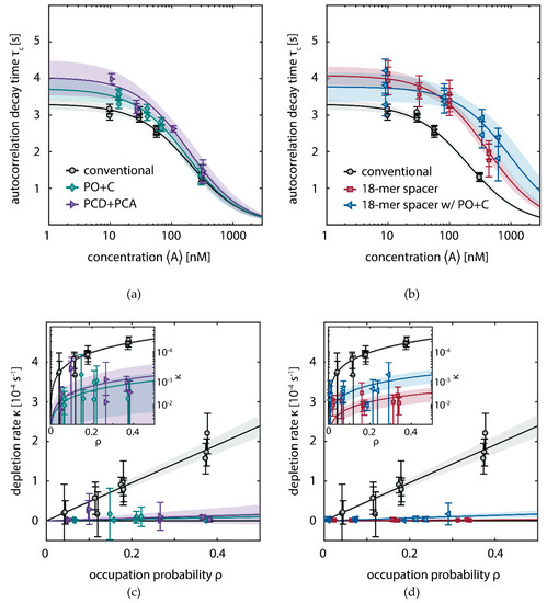 as justified previously [15]. Here, is the average number of particles in the detection volume, the diffusion time, with being the -value of the Gaussian detection volume and the structure parameter. Concentrations are directly obtained from the amplitude of the correlation curves: . As diffusion coefficient, we measured (n = 8), in agreement with previously reported results [15,72] and (n = 4) for the 18-mer spacer. The presented numbers correspond to mean and standard deviation of the indicated n measurements, each of them at least 20 min long.