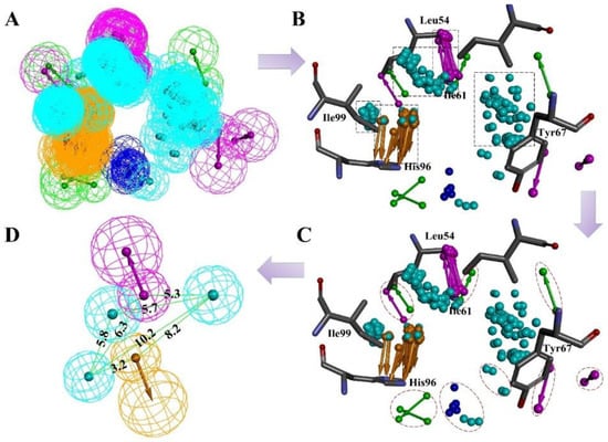(A) The pharmacophore hypotheses were generated by LigandScout algorithm based on 64 MDM2/non-peptide complexes. (B) All 64 pharmacophore queries aligned to define the common features. (C) All common features were clustered to several parts. The features which unmatched the rule are highlighted by red dotted lines. (D) The key features were retained and merged to center features according to the clustering rule. Purple is a hydrogen bond donor; green is a hydrogen bond acceptor, and cyan is a hydrophobic or an aromatic element.