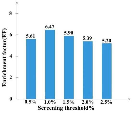 By calculating the EF value in different percent of top molecules ranked with FitValue, we could define the screening threshold of the RLPH, so that the percent of ranked molecules hitting the most active compounds can be confirmed. The results, shown in Figure 2, indicate that the EF value in 0.5%, 1%, 1.5%, 2% and 2.5% top ranked molecules were relatively 5.61, 6.47, 5.90, 5.39 and 5.20. Hit compounds increased along with the total selected molecules. When the percent was greater than 1%, the EF value dropped. Hence, the best percent of ranked molecules to be selected was 1%.