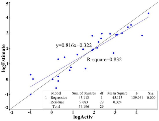 Derivation of r2 from the plot of log Activ vs. log Estimate of the best hypothesis built on receptor-ligand complex. The standard deviation is 0.57, root mean square error is 0.912, R-square (r2) is 0.832 and the F-statistics is 139.064.