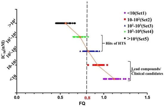 The graph of potency (IC50) vs. FQ of 156 MDM2/p53 PPIIs. The cut-off is represented by a black dashed line. The mean value of FQ in Sets 1–5 is relatively 1.11, 0.94, 0.84, 0.73 and 0.55.