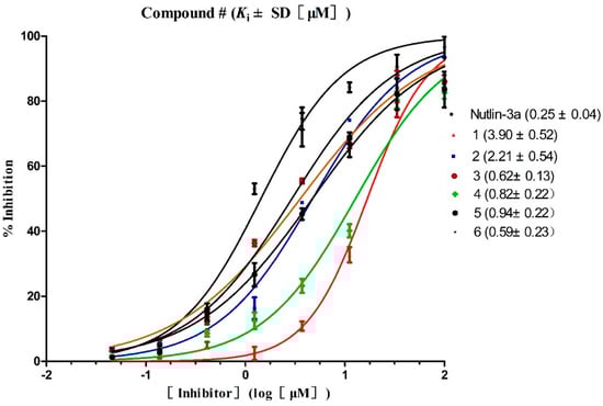 Competitive binding curves of small-molecule inhibitors to MDM2/p53 PPI as determined using a fluorescence-polarization-based binding assay.