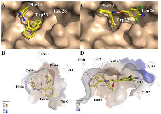 Compound 4 is dihydrodibenzo analogue which is similar to compound C in Figure 9. Compound 1, with the largest FQ among the six compounds, possesses the same indolone scaffold as the clinical candidate APG-115 (Figure 3). Both compounds 2 and 5 have the same moiety, a benzenesulfonamide group. Probably because only two rings exist in compounds 1 and 2, or the molecular size of the two compounds is small, their activities are weaker than those of the other four compounds. However, it is apparent that small molecules could be easily modified for further study. Structure derivation and synthesis could be focused on the three functional groups, pocket Phe19, Trp23 and Leu26, to further enhance the potency.