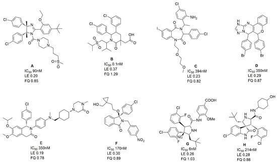 The chemical structures, LE and FQ of eight groups of MDM2/P53 PPIIs used in this study.
