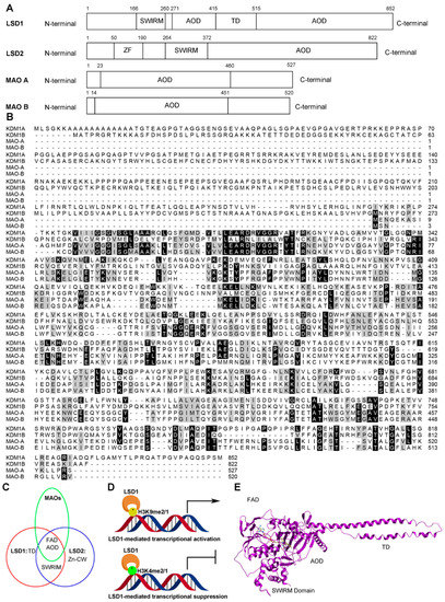The structure and function of LSD1. (A) Domain architectures of four human FAD-dependent oxidation enzymes: LSD1, LSD2, MAO A, and MAO B. (B) Multiple alignment between amine oxidase domains of LSD family and MAOs from human beings. (C) Comparison of the domains of the LSD family and MAOs. FAD: FAD binding motif; TD: tower domain; Zn-CW: Zinc-finger domain. (D) LSD1-mediated transcriptional modulation. (E) Overall structure of LSD1 with trans-2-pentafluorophenylcyclopropylamine (2-PFPA); domains are labeled as in (A).