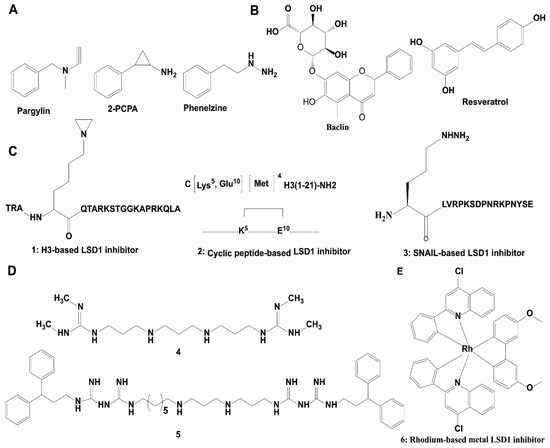 Chemical structures of representative LSD1 inhibitors. (A) Non-selective LSD1 inhibitor; (B) natural product-based LSD1 inhibitors; (C) peptide-based inhibitors; (D) polyamine-based LSD1 inhibitors; (E) metal-based LSD inhibitors.