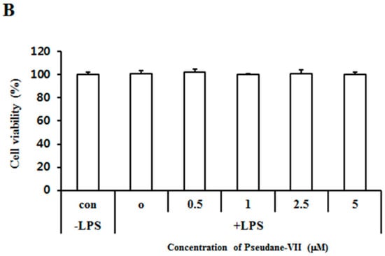Structure of pseudane-VII and cytotoxic effect in BV-2 microglial cells. (A) Structure of pseudane-VII. (B) BV-2 microglial cells (1 × 104 cells/well) were seeded at 96-well culture plates and then incubated at 37 °C in presence of 5% CO2. After incubation, cells were pretreated with various concentrations (0.5, 1, 2.5, and 5 μM) of pseudane-VII for 2 h and were added with LPS (200 ng/mL) for 22 h. The Control added with 0.025% solvent (DMSO:ethanol = 1:9) for 24 h. Cell viability was measured by MTT assay. The result is representative of repeated three independent experiments. Experimental results were indicated as mean (±SE).