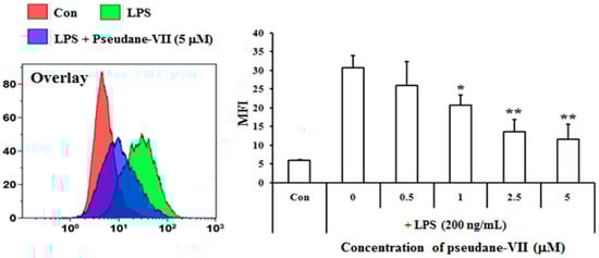 Pseudane-VII inhibits LPS-induced NO and ROS production in BV-2 microglial cells. Cells (2 × 104 cells/well) were cultured in 96-well culture plates at 37 °C in presence of 5% CO2. Seeded cells were pretreated with various concentrations (0.5, 1, 2.5, and 5 μM) of pseudane-VII for 2 h and were added with LPS (200 ng/mL) for 22 h. (A) NO production was determined by Griess assay. Absorbance was measured at 540 nm using microplate reader. (B) ROS production was determined by FACS analysis using DCFDA. The result is representative of repeated three independent experiments. Experimental results were indicated as mean (±SE) (* p < 0.05, ** p < 0.001 vs. LPS-stimulated group).