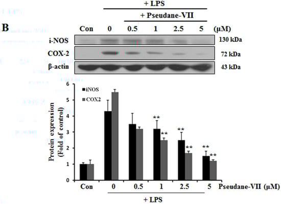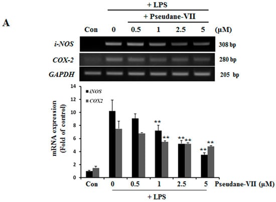 Pseudane-VII suppresses LPS-induced mRNA and protein level of iNOS and COX-2. (A) BV-2 microglial cells were treated with pseudane-VII (0.5, 1, 2.5, and 5 μM) for 2 h and then added with LPS (200 ng/mL) for 6 h. Expression levels of mRNA were confirmed by RT-PCR. GAPDH was used as internal control. (B) BV-2 microglial cells were pretreated with various concentrations (0.5, 1, 2.5, and 5 μM) for 2 h. After 2 h, cells were stimulated with LPS (200 ng/mL) for 24 h. An equal amount of cellular protein was separated by SDS-PAGE and transferred to the PVDF membranes. Membranes were attached to desired antibodies. β-actin was assessed as control. The result is representative of repeated four independent experiments. Experimental results were indicated as mean (±SE) (** p < 0.001 vs. LPS-stimulated group).