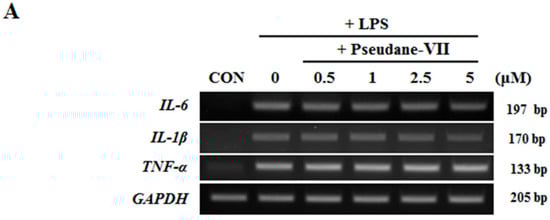 BV-2 microglial cells (3 × 105 cells/well) were seeded in 12-well culture plate. Cultured cells were pretreated with various concentrations of pseudane-VII (0 to 5 μM) for 2 h, and then cells were incubated for 6 h in the absence or presence of LPS. After incubation, pseudane-VII-treated cells were collected by centrifugation and total RNA was isolated from the cells using TRI Reagent according to manufacturer’s protocol. To synthesize cDNA, 0.5 μg of total RNA was primed with oligo dT and reverse transcribed using a mixture of M-MLV RTase, dNTP, and reaction buffer (PromegaCorp, Madison, WI, USA). To measure the mRNA level of inflammatory factors including GAPHD (Forward; 5′-TGCACCACCAACTGCTTAG-3′, Reverse; 5′-GGATGCAGGGATGATGTTC-3′), iNOS (Forward; 5′-CTTGCCCCTGGAAGTTTCTC-3′, Reverse; 5′-GCAAGTGAAATCCGAT GTGG-3′), COX-2 (Forward; 5′-TGGGTGTGAAGGGAAATAAGG-3′, Reverse; 5′-CATCATATTT GAGCCTTGGGG-3′), il-1β (Forward; 5′-GTGTCTTTCCCGTGGACCTT-3′, Reverse; 5′-TCGTTG CTTGGTTCTCCTTG-3′), il-6 (Forward; 5′-CCTTCCTACCCCAATTTCCA-3′, Reverse; 5′-CGCAC TAGGTTTGCCCACTA-3′), and tnf-α (Forward; 5′-GGCCTCTCTACCTTGTGCC-3′, Reverse; 5′-TAGGCGATTACAGTCACGGC-3′), we designed the primers for target genes (Bioneer, Daejeon, Korea). The cDNA was amplified using the Gene Atlas G02 gradient thermal cycler system (Astec, Fukuoka, Japan) e-Taq DNA polymerase kit (Solgent; Daejeon, Korea) and the primers. The PCR products were visualized by RedSafe™ (iNtRON Biotechnology Inc. Seongnam-si, Gyeonggi-do, Korea) and a NaBI Gel-doc system (NEO Science; Suwon, Gyeonggi-do, Korea).