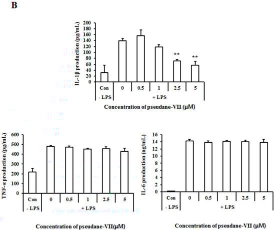 Pseudane-VII decreases LPS-induced pro-inflammatory cytokines. (A) BV-2 microglial cells were pretreated with diverse concentration (0.5, 1, 2.5, and 5 μM) of pseudane-VII for 2 h and then stimulated with LPS (200 ng/mL) for 6 h. Expression levels of mRNA were measured by RT-PCR. (B) Cells (2 × 104 cells/well) were seeded in 96-well culture plates and then were pretreated with pseudane-VII (0.5, 1, 2.5, and 5 μM) for 2 h. Pretreated BV-2 microglia cells were added with LPS (200 ng/mL) for 22 h. Supernatants were collected for cytokine release. IL-1β, TNF-α, and IL-6 were measured by ELISA kit. Results are expressed as means (±SE) from three independent experiments. (** p < 0.001 vs. LPS-stimulated group).