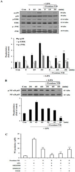 Pseudane-VII regulates LPS-induced phosphorylation of p38, ERK, JNK and NF-κB. (A,B) Cells were starved by using serum-free DMEM for 4 h. Next, cells were pretreated with 5 μM pseudane-VII for 2 h and stimulated with LPS (200 ng/mL) for 5, 15 and 30 min. Cells were lysed using RIPA buffer. Whole cell lysates was separated by SDS-PAGE and transferred to PVDF membranes. These membranes were attached to several antibodies (anti-p-p38, p38, p-ERK, ERK, p-JNK, and JNK antibodies). (C) The cells were pretreated with 10 μM of SB203580, SP600125, U0126 for 1 h and then added with 5 μM pseudane-VII for 2 h. After 2 h, the cells were stimulated with LPS (200 ng/mL) for 21 h. NO production was measured. Result was from representative experiments that confirmed identical patterns. (** p < 0.001 vs. LPS-stimulated group).