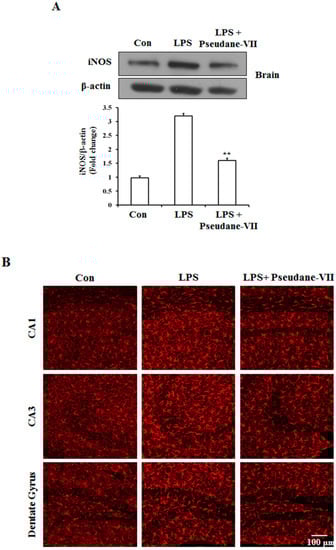 All experiments were approved and performed in accordance with the regulations of the Chosun University Care and Use Committee (IACUC 2018-S0032). All mice were bred and housed at the Chosun University, Specific pathogen free (SFP) Animal Care Unit. C57/BL6 male mice were randomly divided in to 3 groups (Control, LPS, LPS + pseudane-VII). Pseudane-VII was dissolved in sterile saline and pre-administered by intraperitoneal injection (i.p.) (1 mg/kg) for 3 days prior to LPS injection. Also, LPS group was injected intraperitoneally (1 mg/kg) for 24 h. The expression of iNOS in brain was detected by using western blot.