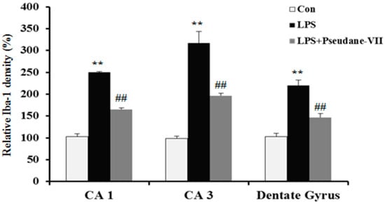 To assess the anti-neuroinflammatory properties of pseudane-VII in vivo, mice were intraperitoneally (i.p.) injected with LPS followed by pseudane-VII pretreatment. Expression levels of iNOS and the microglia activation marker such as Iba-1were then measured. As shown in Figure 6A, pseudane-VII significantly suppressed iNOS expression in brain tissue. Increased Iba-1 signal and enlarged cell body were detected in CA1, CA3, and dentate gyrus (DG) region of LPS administered mice brain. However, pseudane-VII treatment significantly reduced Iba-1 fluorescence intensity on microglia compared to LPS treatment alone. These results suggest that pseudane-VII inhibited microglia activation in brain hippocampus (Figure 6B).