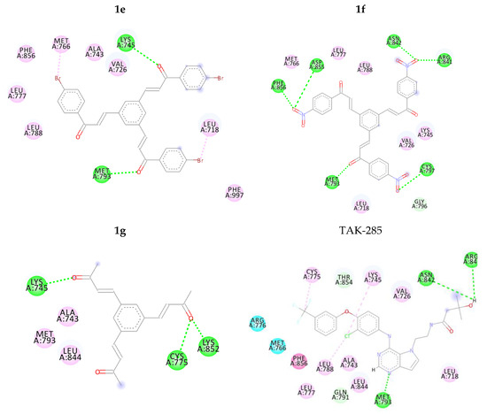 2D intermolecular interactions between docked compounds (1a–1g and TAK-285) and 3POZ protein. Green and Pink colored amino acids represent their contribution in hydrogen bond and hydrophobic interactions, respectively.