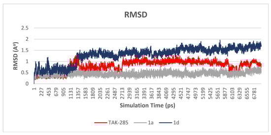 Plot of RMSD vs. time graph for TAK-285 (red), 1a (gray) and 1d (blue). Compound 1a shown to be fluctuating around 0.5 Å, while compounds 1d and TAK-285 were fluctuating around 1.4 and 1.0 Å.