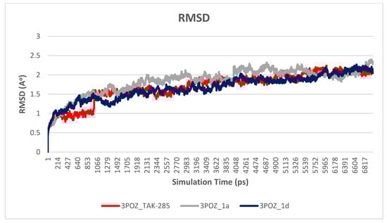 According to molecular docking results, two compounds, 1a and 1d, as well as TAK-285 were selected to further investigate the structural changes upon ligand binding and intermolecular interactions using molecular dynamics (MD) simulations. Seven nanoseconds molecular dynamics simulation have been carried out for each of the three systems and the last nanosecond was used to calculate the free energy of ligand binding using MM-GBSA method. The stability of the systems was examined by monitoring the thermodynamic properties, such as pressure, temperature, potential energy and kinetic energy, as shown in Figures S1–S3 in the Supplementary Materials.