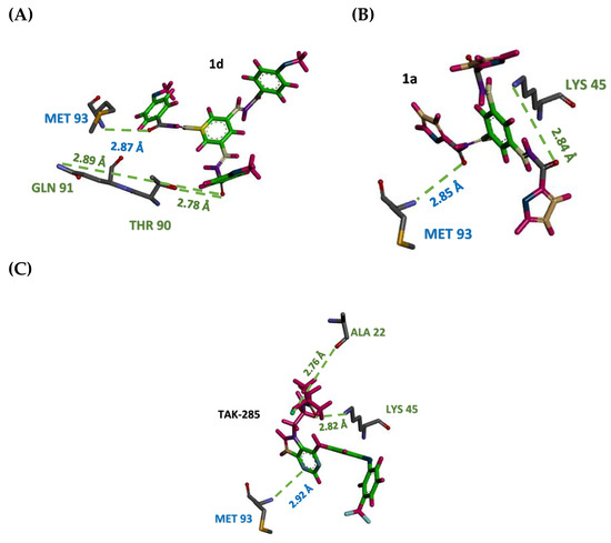Stick representation of simulated compounds 1a (A), 1d (B) and TAK-285 (C) site forming hydrogen bond (green dots) interactions with amino acid residues in the active. MET 93 amino acid found to participate in the hydrogen bond interaction with the three simulated compounds.
