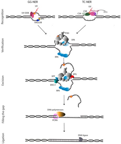 Schematic overview of the Nucleotide Excision Repair (NER) pathway. Lesion recognition leads to GG-NER, whereas stalled transcription leads to TC-NER. This is followed by damage verification, incision at 5′ side by ERCC1-XPF and 3′ side of the lesion by XPG. The gap left after the incisions is refilled by DNA re-synthesis. Adapted from [22,24,28].