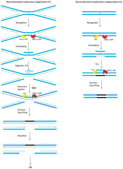 Cytotoxic and antitumor agents can form covalent linkages on DNA in different ways including intra-strand, between two complementary strands, and even between a DNA base and a protein residue. ICLs, though accountable for only a small amount of the total DNA adducts, are one of the most deleterious DNA lesions because this covalent binding prevents DNA from separation and stalls replication and transcription processes, thus causing chromosome rearrangement or break [83,84]. These lesions arise either exogenously from exposure to toxic mutagens such as cisplatin and carcinogens in cigarette smoke, or endogenously from amino-acid metabolism or lipid peroxidation for instance from a high fat diet. The formed DNA adducts arrest replication and transcription. Using an ERCC1 deficient mouse model, it has been demonstrated that cross-linking agents such as 4-hydroxy-2-nonenal (HNE) do not only produce ICLs but can also cause multiple other DNA lesions that depending on damage type, may trigger a separate repair pathway [84,85]. ICL repair occurs during the S or G0/G1 phase, in the presence or absence of replication proteins. Therefore, ICL repair pathways are classified as replication-dependent and replication-independent (Figure 3) [83,84,86,87,88]. In both ICL repair processes, it is thought that the Fanconi anemia (FA) network coordinates the function of major groups of proteins from the NER pathway, the homologous recombination (HR) and the DNA translesion synthesis (TLS) pathway. Indeed, mutations in genes regulating the elimination of ICLs can cause FA [83,89]. It is increasingly understood that in ICL repair, FA proteins function through sensing, recognition and processing of ICLs [90].