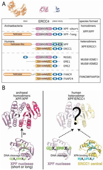 XPF consists of a N-terminal helicase-like domain and a central excision repair cross complementation group 4 (ERCC4) endonuclease domain, followed by a C-terminal helix-hairpin-helix (HhH)2 putative DNA-binding domain. The non-catalytic ERCC1 protein also contains an ERCC4-like domain—known as the central domain—that lacks the catalytic motif. Like in XPF, the central domain is followed by a helix-hairpin-helix (HhH)2 domain (Figure 5A) [2,6]. The dimerization of XPF and ERCC1 takes place through a direct interaction between the two (HhH)2 domains.