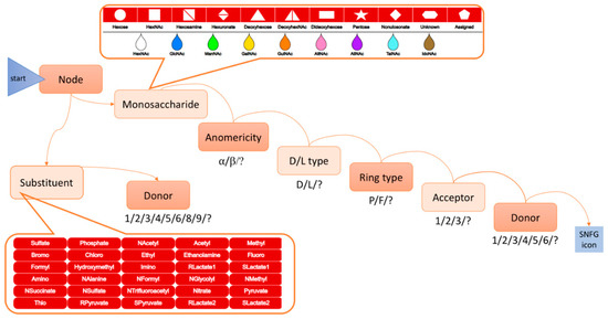 Drawing process of an SNFG icon in the “normal mode”. The first task is to select between a monosaccharide and a substituent. If the choice is “monosaccharide”, next, the user will select the geometrical and color attributes of a monosaccharide in the SNFG nomenclature from (1) an array of shapes and (2) an array of colors (framed at the top of this figure). If the choice is “substituent”, multiple buttons are displayed for selection (framed at the bottom of this figure). Then the user successively selects optional values (shown below each box) to specify further the characteristics of the ring and the linkage (anomericity, carbon acceptor and donor shown in boxes). This attribute selection process results in the placement of the corresponding monosaccharide/substituent on the screen. It is then repeated as many times as the targeted structure contains monosaccharides/substituents.
