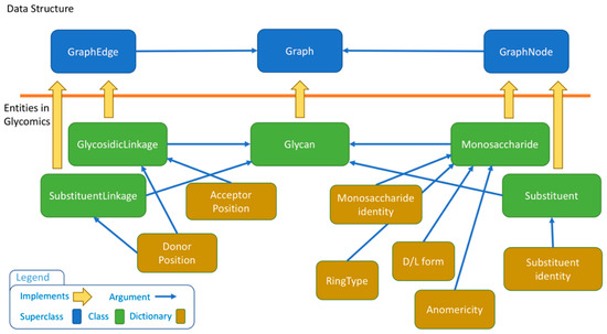To control data input, the core library provides a collection of dictionaries, one for each glycan-specific entity. These dictionaries encompass anomericity, ring type, isomer, etc. see Tables S1–S5. The user is required to pick an entry from the dictionary thereby blocking possible arbitrary inputs. At the level of nodes, the library provides dictionaries for MonosaccaridesTypes, SubstituentTypes, RingTypes and Anomericity. In addition, edges are defined from donor and acceptor linkage positions. The data structure is detailed in Figure 3 where the relationships between entities are detailed.