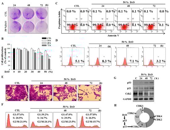 Deuterium oxide (D2O) inhibited the proliferation of activated hepatic stellate cells (HSCs). HSC-T6 cells were treated with 50% D2O for 24, 48, and 72 h (A). The cells were then stained with 0.5% crystal violet and were visualized by photography (B). The stained cells were rinsed with dimethyl sulfoxide (DMSO), and absorbance at 570 nm due to the crystal violet staining was measured. The D2O-treated HSC cells were stained with Annexin V and propidium iodide (PI), and flow cytometry was performed to determine the degree of apoptosis (C). The lower right quadrant (annexin V+/propidium iodide [PI]−) and upper right quadrant (annexin V+/PI+) represent the percentage of cells in early and late apoptosis, respectively. To measure intracellular reactive oxygen species (ROS) levels, dichlorodihydrofluorescein diacetate (DCFDA; 20 µM) was added after harvesting of HSCs exposed to 50% D2O (D). The morphology of stained HSCs was examined by microscopy (scale bar, 100 µm) (E). A flow-cytometric analysis of the cell cycle using PI was performed (F). The expression levels of p53, p21, and CDK2 were evaluated by western blotting (G). GAPDH served as a loading control. A proposed scheme illustrating the mechanism by which D2O arrests cells in the S phase via downregulation of aquaporin (AQP) 11 (H). ** p < 0.01 or * p < 0.05 as compared with the control. Data are presented as mean ± SD (n = 3).