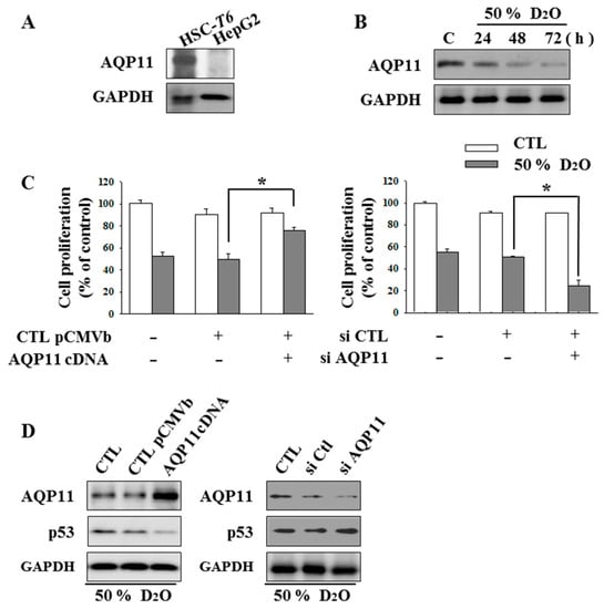 To gain insights into the role of AQP11 in D2O-treated HSCs, we first analyzed the expression of AQP11 in both HSCs and parenchymal HepG2 cells [23]. AQP11 was specifically expressed in HSC-T6 cells (Figure 2A), and D2O treatment decreased AQP11 expression levels (Figure 2B). Next, to verify whether AQP11 expression regulates cell proliferation, AQP11 was overexpressed by a genetic approach. Of note, elevated AQP11 levels counteracted the D2O-mediated inhibition of proliferation. On the other hand, cells transfected with an AQP11-targeted small interfering RNA (siRNA) showed enhanced inhibition of proliferation (Figure 2C). In addition, the expression levels of AQP11 negatively correlated with those of p53 (Figure 2D).