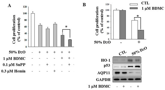 Cotreatment of HSC-T6 cells with deuterium oxide (D2O) and bisdemethoxycurcumin (BDMC) decreased the expression of heme oxygenase (HO)-1. HSC-T6 cells were incubated with or without 50% D2O for 24 h. In addition, the D2O-treated cells were exposed to 1 µM BDMC, 0.1 µM SnPP (tin protoporphyrin), or 0.3 µM hemin (A). The effects of cotreatment of HSC-T6 cells with D2O and BDMC on their proliferation and expression of HO-1, p53, and AQP11 (B). The expression of HO-1, p53, and aquaporin (AQP) 11 was assessed by western blotting. GAPDH served as the loading control. Data are representative of three independent experiments and are expressed as mean ± SD, * p < 0.05.